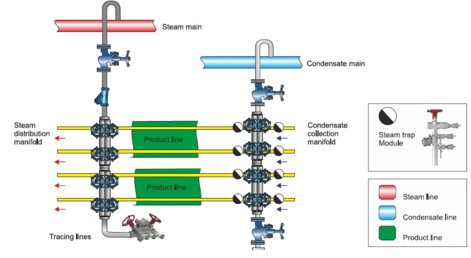 Steam is delivered to individual circuits via steam supply manifolds. The resulting condensate is efficiently removed using pipeline connectors and tracer line traps, collected at condensate collection manifolds, and often returned to condensate headers using steam operated pump traps.