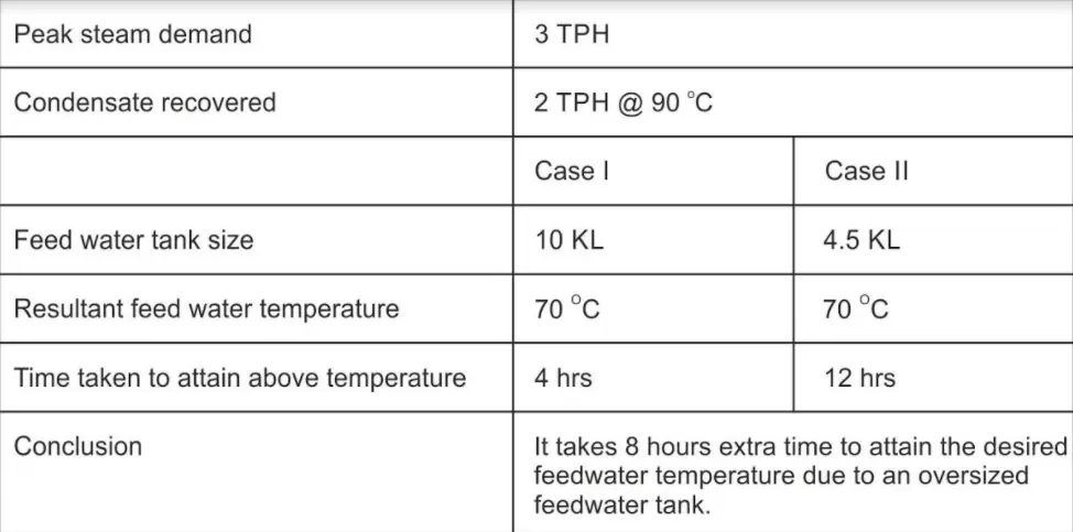As a rule of thumb, the feed water tank should be sized to 1.5 times of the peak steam demand. This ensures that sufficient water is available for the boiler at any point in time while keeping the above losses to a minimum.